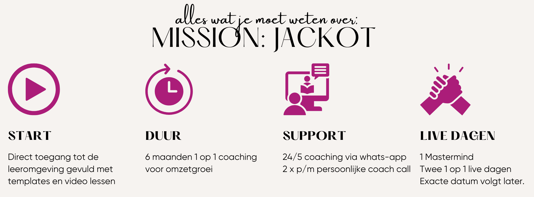 Mission Jackpot is niet zomaar een traject. Dit is jouw kans om je business te transformeren en die krachtige vrouw te worden die haar eigen succes bepaalt. Dit gaat niet over meer werk doen, het gaat over het juiste werk doen – met passie, focus en strategie. Geen eindeloze to-do lijsten of onduidelijke plannen, maar concrete stappen die je met overtuiging kunt zetten om je doelen te bereiken.