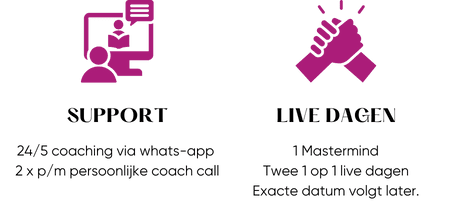 - Twee 1-op-1 live dagen, voor een echte deepdive en waarbij we een hele dag samen aan jouw bedrijf werken