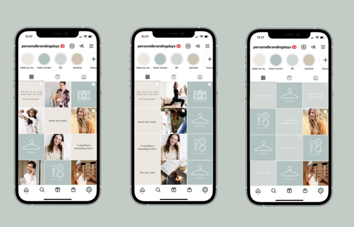 Hieronder staan drie voorbeelden van hoe je een patroon zou kunnen doorvoeren op je instagram feed.